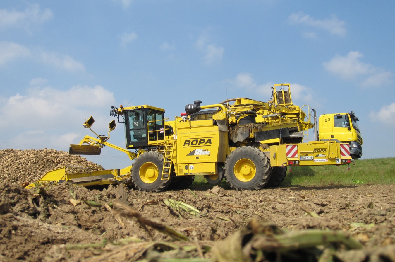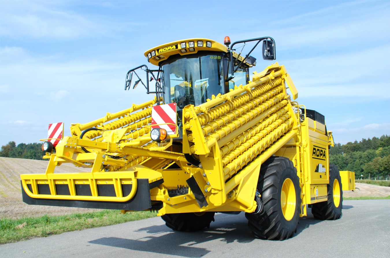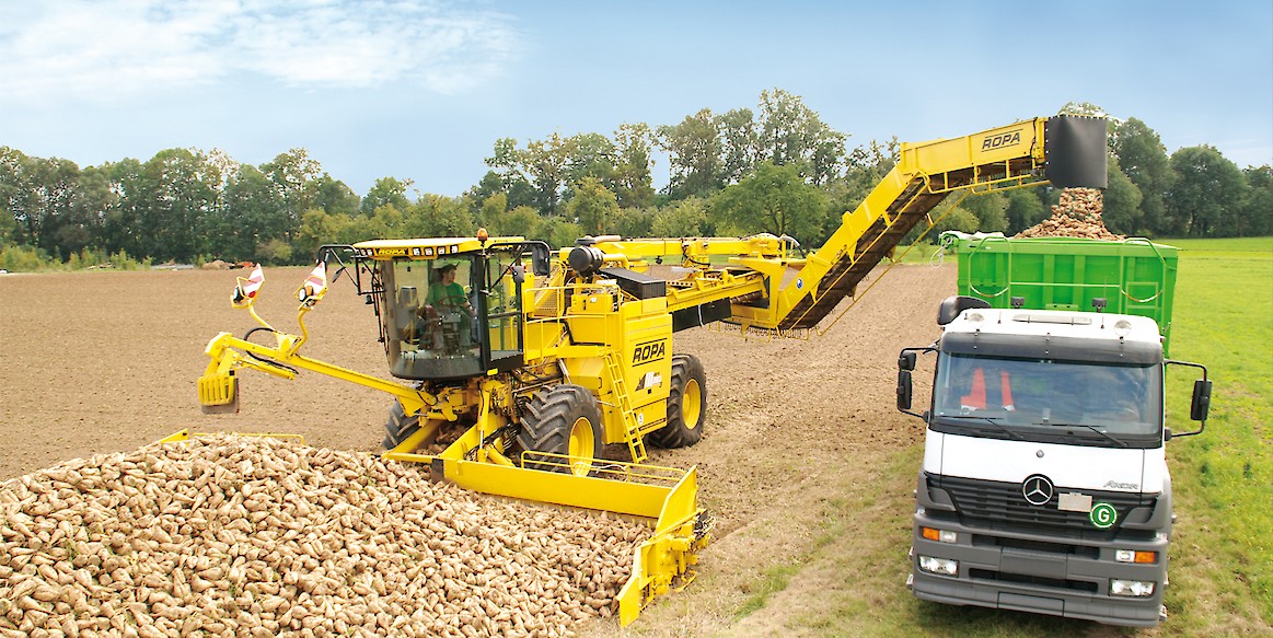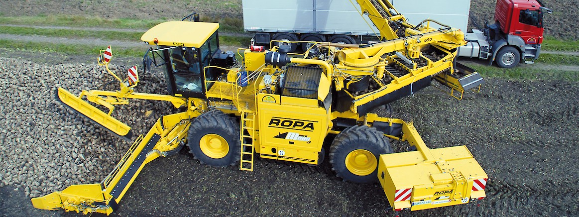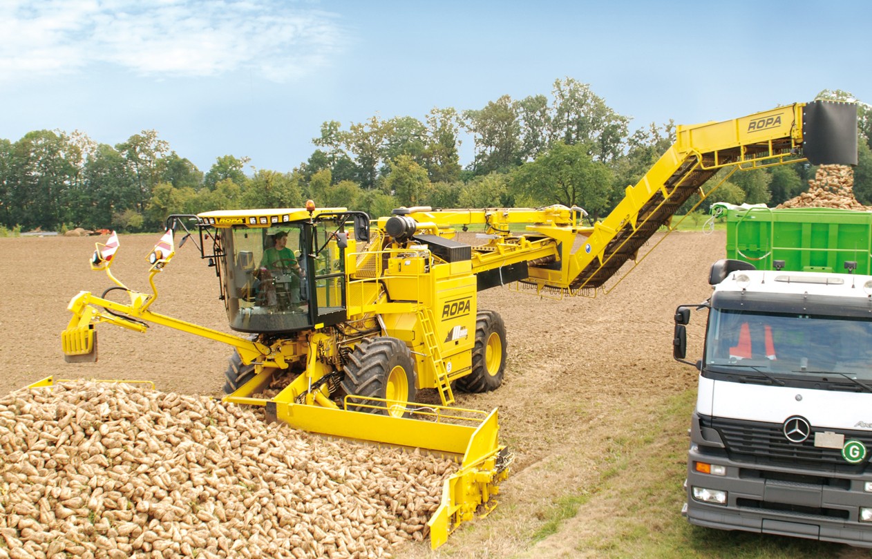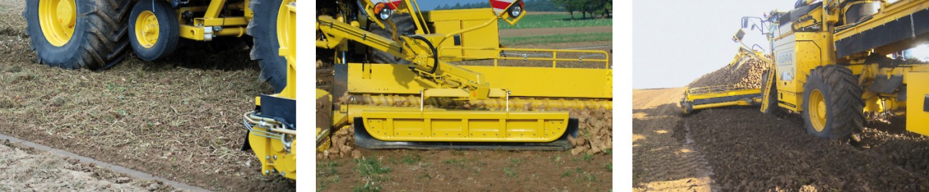 Бурт корнеплодов раcпределяется уникальной ROPA приемной частью шириной 8,70 м равномерно налево и направо. Делитель бурта, имеющий постоянный эксцентриковый привод, разрыхляет бурт и обеспечивает равномерное разделение потока корнеплодов. Результатом этого решения является низкий расход энергии при продвижении машины вглубь бурта. Свободное пространство под приемным транспортером и равномерное распределение отчищенной грязи под всей шириной приемного стола являются значительными преимуществами этой концепции подбора свеклы.