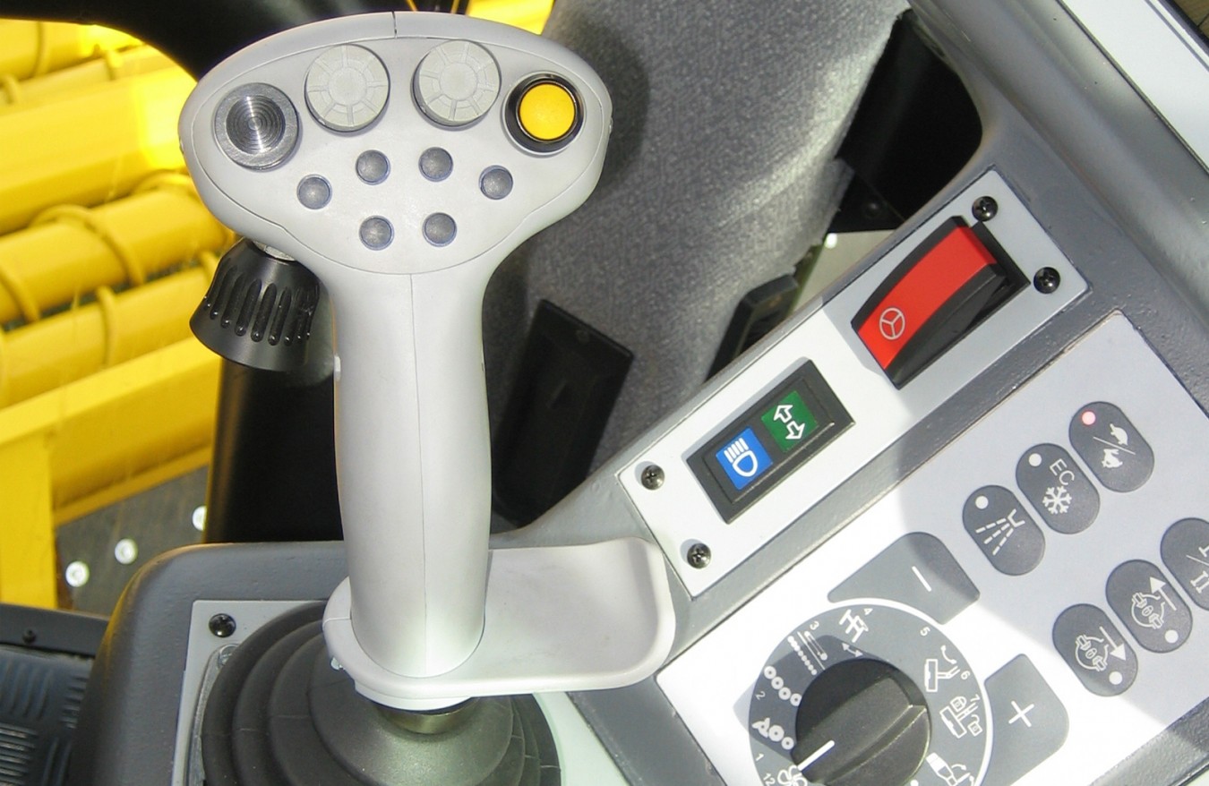 Правым джойстиком осуществляется управление всеми важными функциями погрузки, регулирование глубины хода, есть возможность отдельного включения/выключения любых узлов привода и даже их резервирования. Так сказать, вся машина у водителя под одной рукой, а другая рука свободна для радио или телефона. Независимо от того, осуществляется отгрузка на левую или на правую сторону, благодаря реверсированию направления отгрузки джойстиком управлять перегрузчиком удобно всегда.