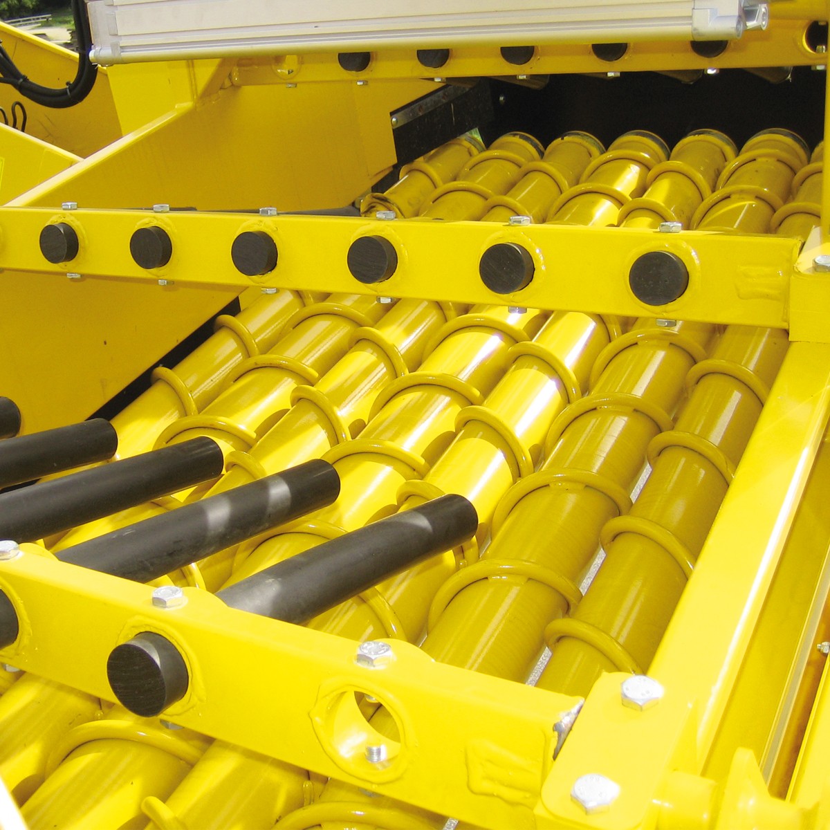 Пальцевые вальцы работают в почве на глубине 7 см под буртом. Таким образом сахарная свекла очень бережно поднимается снизу и подается вверх через транспортирующие на очищающие вальцы. Они обеспечивают одновременно очистку и равномерную подачу корнеплодов. При помощи полиуретановых пальцев происходит очистка корнеплодов с левого и правого краев приемного стола и одновременно подача свеклы к 4-м затягивающим вальцам, движущимся навстречу друг другу. Эффект затягивания обеспечивает последующую интенсивную очистку от остатков почвы, ботвы, головок свеклы, а также от травы и сорняков и при этом не повреждая свеклу. Также измельченная солома, используемая для укрывания буртов, очищается затягивающими вальцами и распределяется под всей шириной приемного стола.