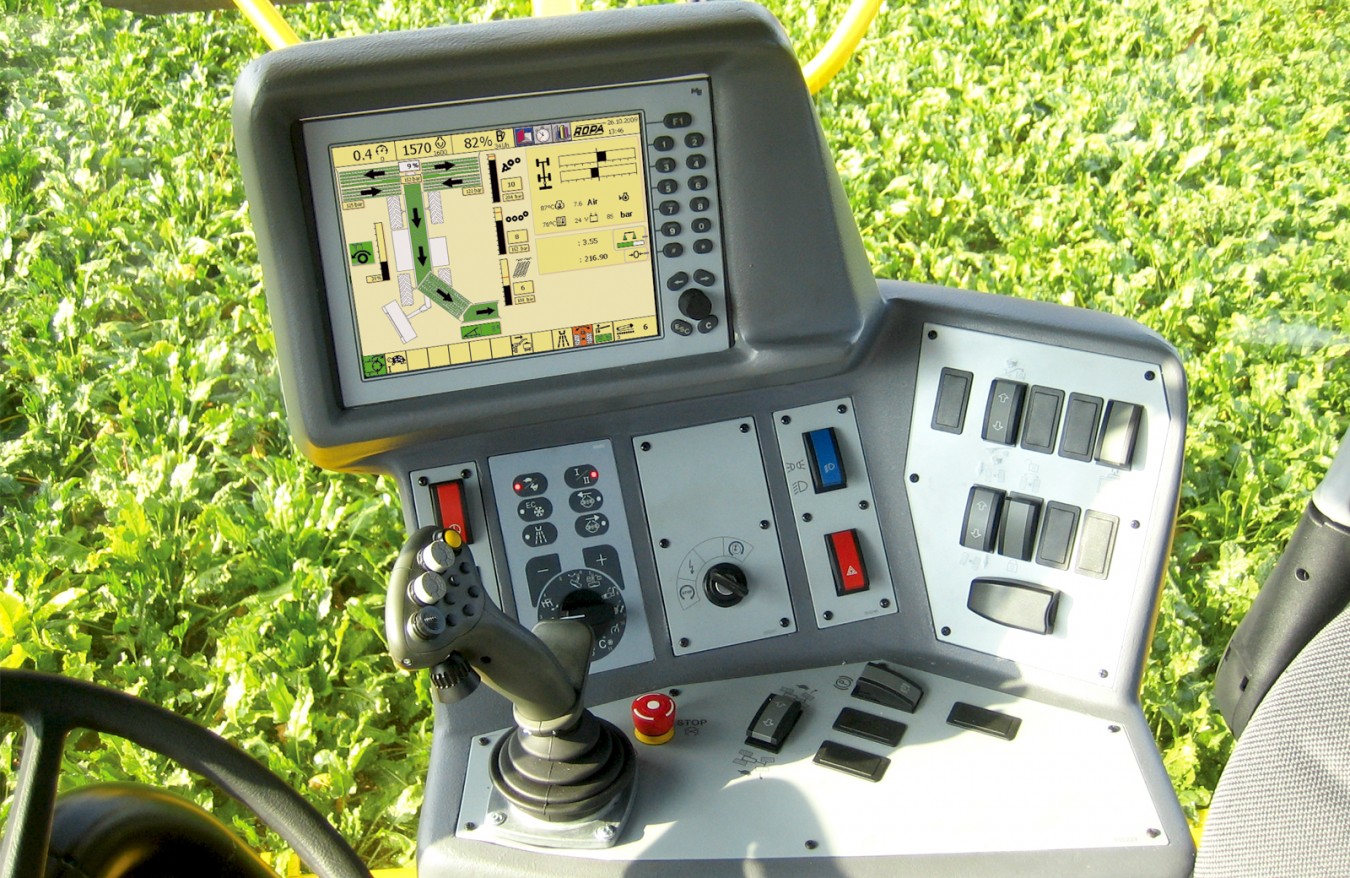 Приемный транспортер ROPA, имеющий не повреждающие корнеплоды, высокопрочные и мягкие полиуретановые захваты, бережно и быстро транспортирует свеклу под кабиной к следующему элементу очистки. Поток свеклы хорошо и удобно заметен с поворотного сиденья в кабине. При выключении приемного транспортера подбор и подача выключаются автоматически.
