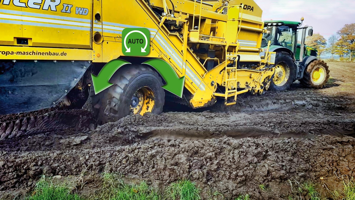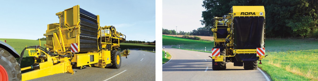 Проход и маневрирование выполняются с легкостью! ROPA Keiler 2 может быть опционально оснащен ведущим колесом для увеличения тяги и защиты почвы даже в чрезвычайно сложных условиях копки. Даже с опцией шин с большим объемом 850/50 R 30.5 транспортная ширина на дороге составляет всего 3,00 метра. Встроенный механизм свободного хода оси позволяет достигать скорости 40 км/ч при движении по дорогам.