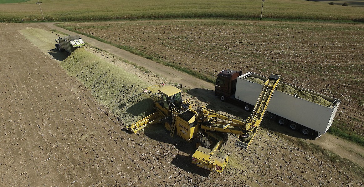 В последующем кукурузный силос загружается при помощи NawaRo-Maus от ROPA и перегружается с помощью перегрузчика (до 13 м начиная с середины бурта) на грузовые автомобили. В практическом использовании продуктивность перегрузки составляет до 15 м³ в минуту, посредством переменно-регулируемого наземного приспособления системы приема Nawaro, потери существенно снижаются.