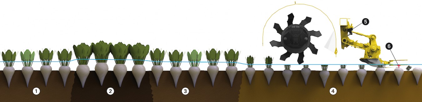 Обе системы регулируют рабочую глубину в зависимости от изменения состояния свеклы при уборке урожая в пределах всего поля. Автоматические системы реагируют на разнообразную высоту головок свеклы или неровности почвы, которые располагаются поперечно направлению движения. Уже известная измерительная система на дорезателе была усовершенствована дополнительным измерительным устройством для определения контура почвы непосредственно на свекловичных рядках.